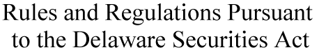 "Set forth below is a table of contents for the Rules and Regulations Pursuant to the Delaware Securities Act. The table of contents is broken down into sections for your convenience. Simply click on a section number to view the entire text for that section."